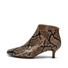 Saga. A feminine ankle bootie made in leather with stunning snake print details and elegant zip features. It comes with a modern heel and a feminine silhouette, making it suitable for wearing both during the day and at night.